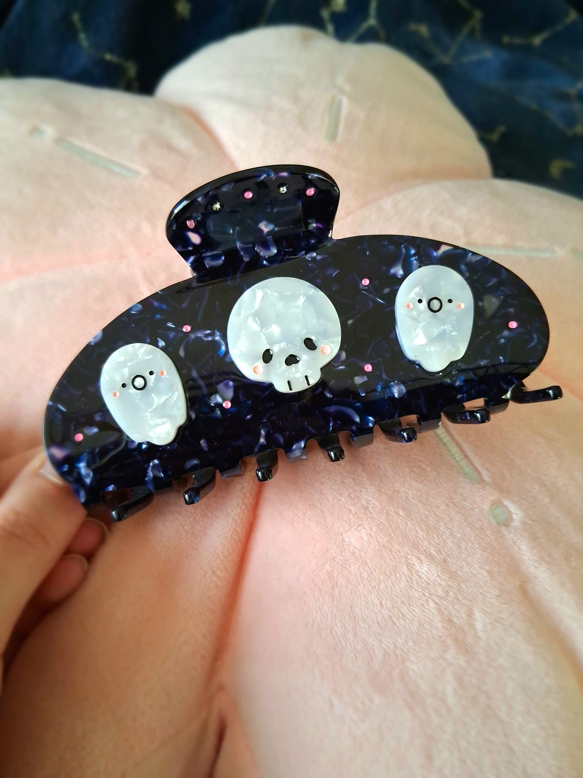 Spooky claw clip with ghost and skull decoration made with acetate and rhinestones.